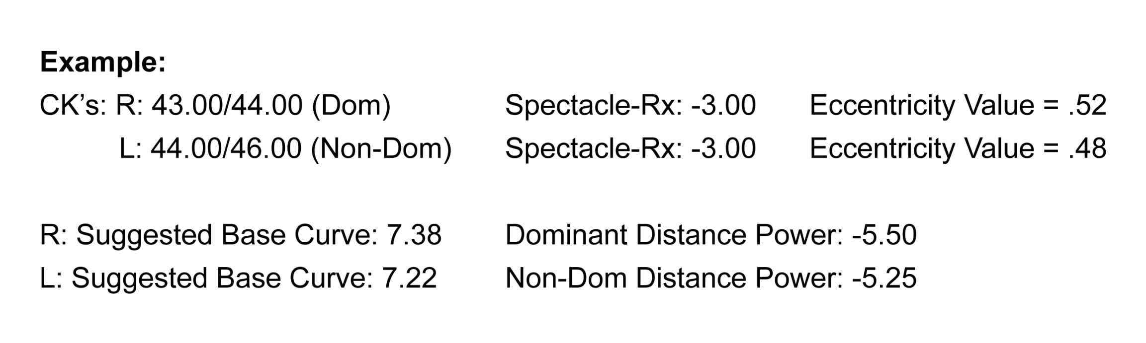 Select patients with a +2.50 or less ADD power. Take central K readings, refraction, and topography if available. Determine which is the non-dominant eye. To increase the ADD power, over-plus the dominant eye by +.25 and the non-dominant eye by +.50 on early presbyopes, and up to +1.00 or more for advanced presbyopes.