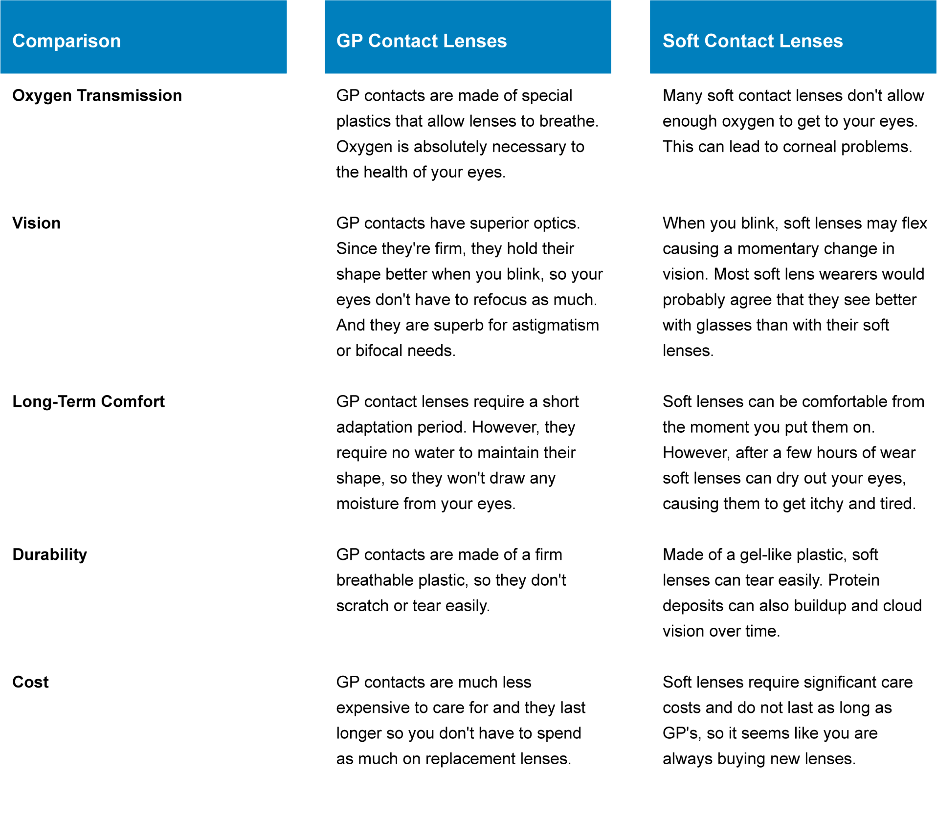 You may not know the advantages that GP's have over soft contacts. Initial comfort is the only area where soft lenses rate better than GP contacts. Once you are used to them, GP lenses are comfortable, healthier, durable, easy to care for, cost less and provide better vision. Review the comparison chart below to see how GP's rate.